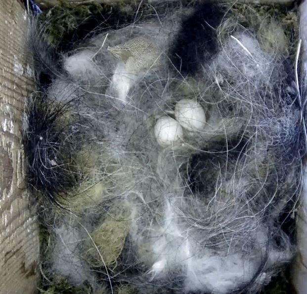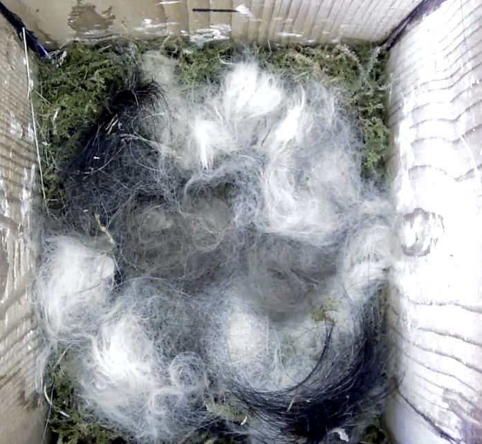 Eerst wat takjes voor in de hoeken daarna veel mos en als laatste zachte donsjes om het zacht te maken voor de kostbase eieren.