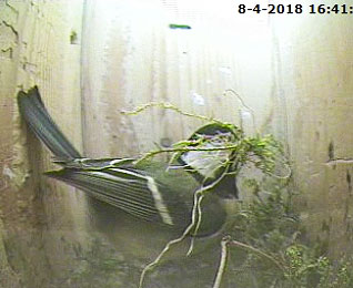 De bouw van het Koolmees nest is begonnen vandaag. Voorzichtig wordt er af en toe wat mos mee naar binnen genomen en vervolgens deskundig verdeeld over de bodem van de nestkast.